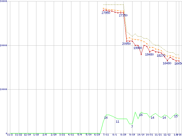※このグラフは過去のデータも税率5%相当に調整した税込み相当額のグラフです。 税率変更や、総額表示方式導入(2004年4月)の影響は除いています。 | | | ●凡例 | 最安値 (点線部は販売店未確認 または未調査) | 平均値 | 最高値 | ショップ数 |