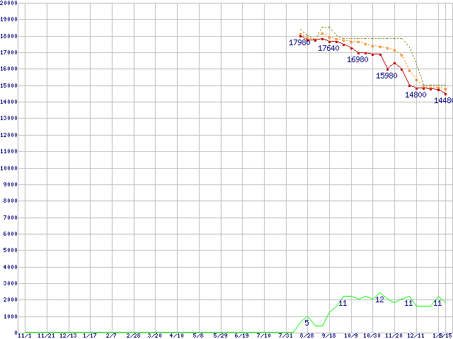 ※このグラフは過去のデータも税率5%相当に調整した税込み相当額のグラフです。 税率変更や、総額表示方式導入(2004年4月)の影響は除いています。 | | | ●凡例 | 最安値 (点線部は販売店未確認 または未調査) | 平均値 | 最高値 | ショップ数 |
