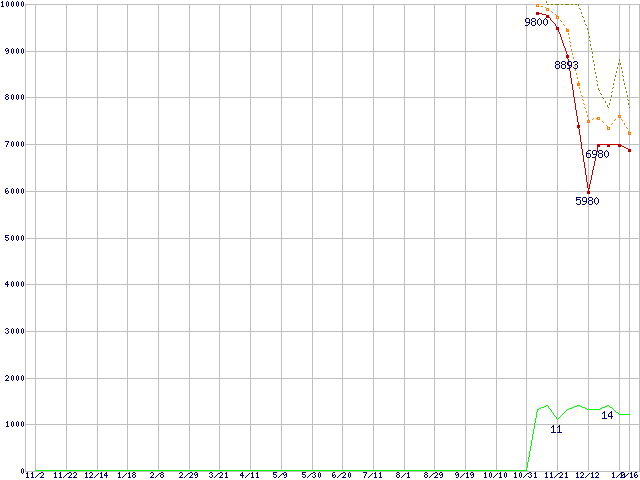 | Athlon X2 5050e (2.6GHz,L2 512KB×2)の価格推移 | | | (2007年11月2日~2009年1月16日) |