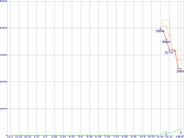 ※このグラフは過去のデータも税率5%相当に調整した税込み相当額のグラフです。 税率変更や、総額表示方式導入(2004年4月)の影響は除いています。 | | | ●凡例 | 最安値 (点線部は販売店未確認 または未調査) | 平均値 | 最高値 | ショップ数 |