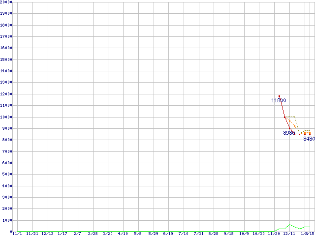 ※このグラフは過去のデータも税率5%相当に調整した税込み相当額のグラフです。 税率変更や、総額表示方式導入(2004年4月)の影響は除いています。 | | | ●凡例 | 最安値 (点線部は販売店未確認 または未調査) | 平均値 | 最高値 | ショップ数 |