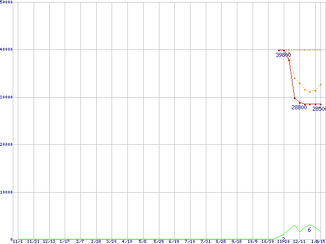 ※このグラフは過去のデータも税率5%相当に調整した税込み相当額のグラフです。 税率変更や、総額表示方式導入(2004年4月)の影響は除いています。 | | | ●凡例 | 最安値 (点線部は販売店未確認 または未調査) | 平均値 | 最高値 | ショップ数 |