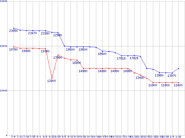 | Socket AM2 (HyperTransport 3.0,Quad Core,TDP 65W)の最安値推移 | | | (2008年7月4日~2009年1月16日) |