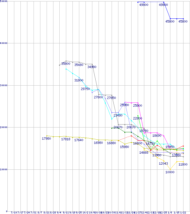 | HDD/SSD 60GB~80GB未満の最安値推移 | | | (2008年7月10日~2009年1月22日) |