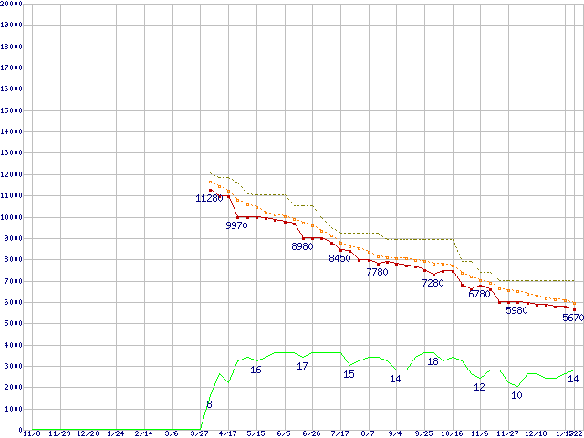 ※このグラフは過去のデータも税率5%相当に調整した税込み相当額のグラフです。 税率変更や、総額表示方式導入(2004年4月)の影響は除いています。 | | | ●凡例 | 最安値 (点線部は販売店未確認 または未調査) | 平均値 | 最高値 | ショップ数 |