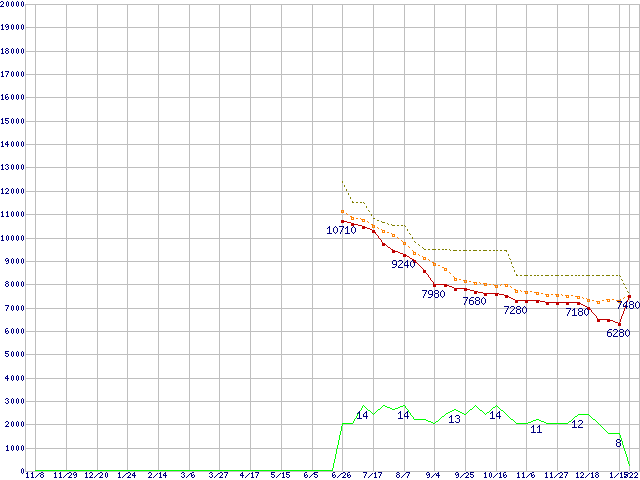 ※このグラフは過去のデータも税率5%相当に調整した税込み相当額のグラフです。 税率変更や、総額表示方式導入(2004年4月)の影響は除いています。 | | | ●凡例 | 最安値 (点線部は販売店未確認 または未調査) | 平均値 | 最高値 | ショップ数 |