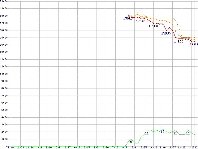 ※このグラフは過去のデータも税率5%相当に調整した税込み相当額のグラフです。 税率変更や、総額表示方式導入(2004年4月)の影響は除いています。 | | | ●凡例 | 最安値 (点線部は販売店未確認 または未調査) | 平均値 | 最高値 | ショップ数 |