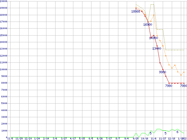 ※このグラフは過去のデータも税率5%相当に調整した税込み相当額のグラフです。 税率変更や、総額表示方式導入(2004年4月)の影響は除いています。 | | | ●凡例 | 最安値 (点線部は販売店未確認 または未調査) | 平均値 | 最高値 | ショップ数 |