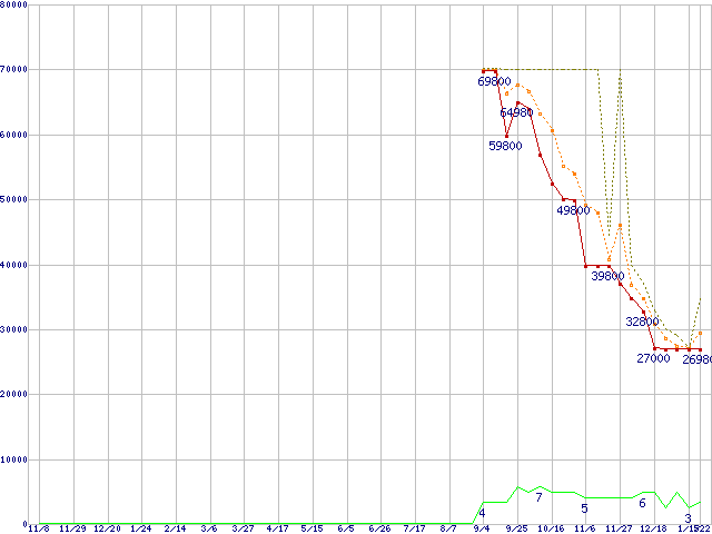 ※このグラフは過去のデータも税率5%相当に調整した税込み相当額のグラフです。 税率変更や、総額表示方式導入(2004年4月)の影響は除いています。 | | | ●凡例 | 最安値 (点線部は販売店未確認 または未調査) | 平均値 | 最高値 | ショップ数 |