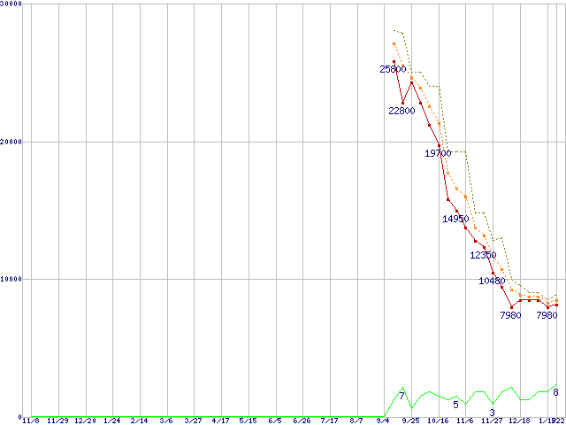 ※このグラフは過去のデータも税率5%相当に調整した税込み相当額のグラフです。 税率変更や、総額表示方式導入(2004年4月)の影響は除いています。 | | | ●凡例 | 最安値 (点線部は販売店未確認 または未調査) | 平均値 | 最高値 | ショップ数 |