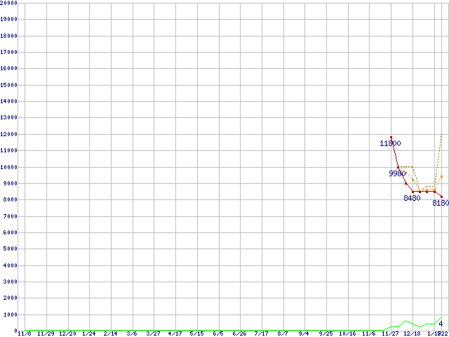 ※このグラフは過去のデータも税率5%相当に調整した税込み相当額のグラフです。 税率変更や、総額表示方式導入(2004年4月)の影響は除いています。 | | | ●凡例 | 最安値 (点線部は販売店未確認 または未調査) | 平均値 | 最高値 | ショップ数 |