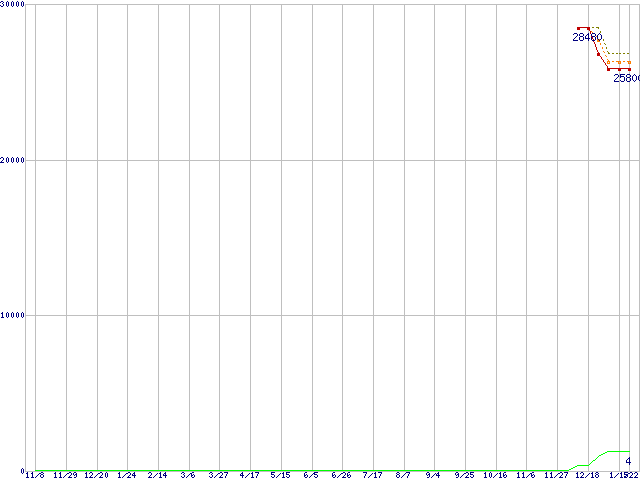 ※このグラフは過去のデータも税率5%相当に調整した税込み相当額のグラフです。 税率変更や、総額表示方式導入(2004年4月)の影響は除いています。 | | | ●凡例 | 最安値 (点線部は販売店未確認 または未調査) | 平均値 | 最高値 | ショップ数 |