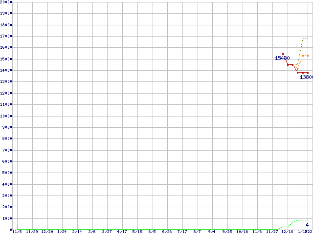 ※このグラフは過去のデータも税率5%相当に調整した税込み相当額のグラフです。 税率変更や、総額表示方式導入(2004年4月)の影響は除いています。 | | | ●凡例 | 最安値 (点線部は販売店未確認 または未調査) | 平均値 | 最高値 | ショップ数 |