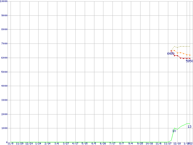 ※このグラフは過去のデータも税率5%相当に調整した税込み相当額のグラフです。 税率変更や、総額表示方式導入(2004年4月)の影響は除いています。 | | | ●凡例 | 最安値 (点線部は販売店未確認 または未調査) | 平均値 | 最高値 | ショップ数 |