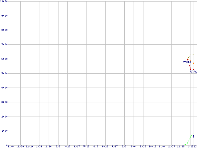 ※このグラフは過去のデータも税率5%相当に調整した税込み相当額のグラフです。 税率変更や、総額表示方式導入(2004年4月)の影響は除いています。 | | | ●凡例 | 最安値 (点線部は販売店未確認 または未調査) | 平均値 | 最高値 | ショップ数 |