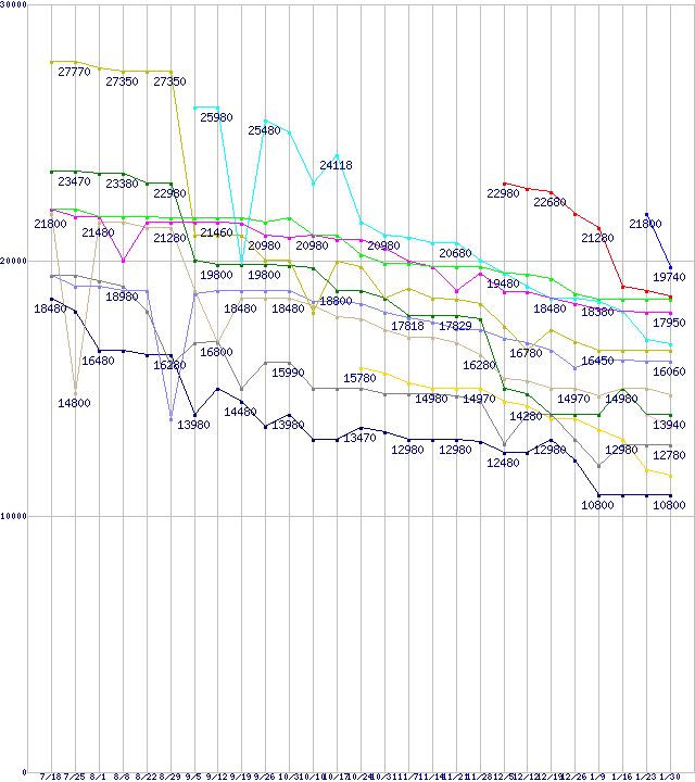 | CPU主要製品(最安値1万円~2万円未満)の最安値推移 | | | (2008年7月18日~2009年1月30日) |