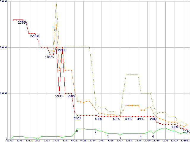 ※このグラフは過去のデータも税率5%相当に調整した税込み相当額のグラフです。 税率変更や、総額表示方式導入(2004年4月)の影響は除いています。 | | | ●凡例 | 最安値 (点線部は販売店未確認 または未調査) | 平均値 | 最高値 | ショップ数 |