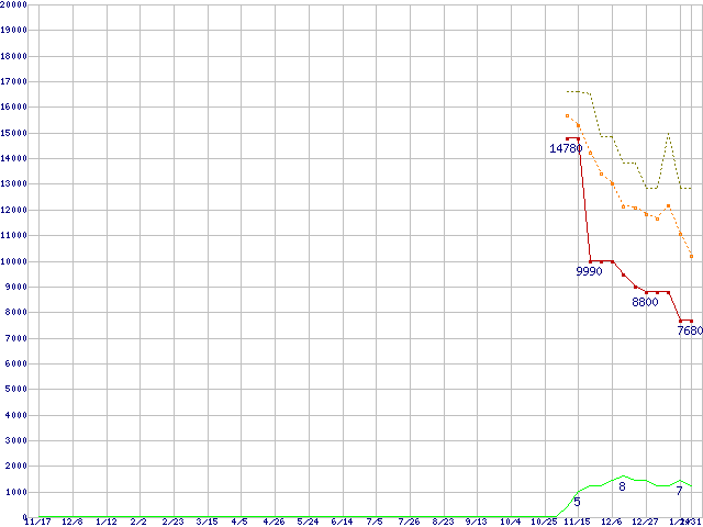 ※このグラフは過去のデータも税率5%相当に調整した税込み相当額のグラフです。 税率変更や、総額表示方式導入(2004年4月)の影響は除いています。 | | | ●凡例 | 最安値 (点線部は販売店未確認 または未調査) | 平均値 | 最高値 | ショップ数 |
