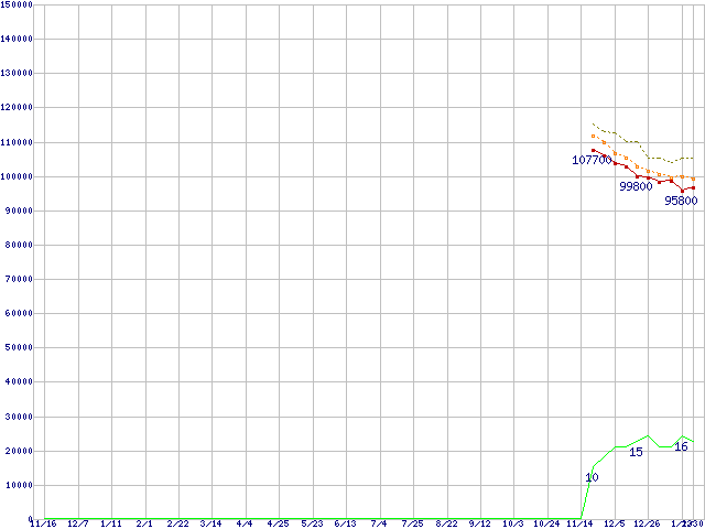 ※このグラフは過去のデータも税率5%相当に調整した税込み相当額のグラフです。 税率変更や、総額表示方式導入(2004年4月)の影響は除いています。 | | | ●凡例 | 最安値 (点線部は販売店未確認 または未調査) | 平均値 | 最高値 | ショップ数 |
