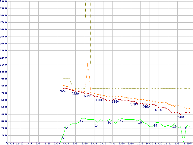 ※このグラフは過去のデータも税率5%相当に調整した税込み相当額のグラフです。 税率変更や、総額表示方式導入(2004年4月)の影響は除いています。 | | | ●凡例 | 最安値 (点線部は販売店未確認 または未調査) | 平均値 | 最高値 | ショップ数 |