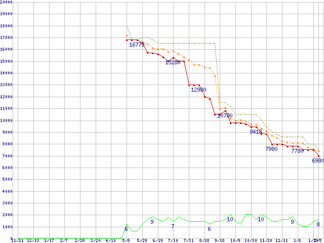 ※このグラフは過去のデータも税率5%相当に調整した税込み相当額のグラフです。 税率変更や、総額表示方式導入(2004年4月)の影響は除いています。 | | | ●凡例 | 最安値 (点線部は販売店未確認 または未調査) | 平均値 | 最高値 | ショップ数 |