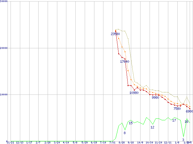 ※このグラフは過去のデータも税率5%相当に調整した税込み相当額のグラフです。 税率変更や、総額表示方式導入(2004年4月)の影響は除いています。 | | | ●凡例 | 最安値 (点線部は販売店未確認 または未調査) | 平均値 | 最高値 | ショップ数 |
