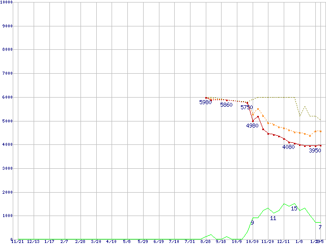 ※このグラフは過去のデータも税率5%相当に調整した税込み相当額のグラフです。 税率変更や、総額表示方式導入(2004年4月)の影響は除いています。 | | | ●凡例 | 最安値 (点線部は販売店未確認 または未調査) | 平均値 | 最高値 | ショップ数 |