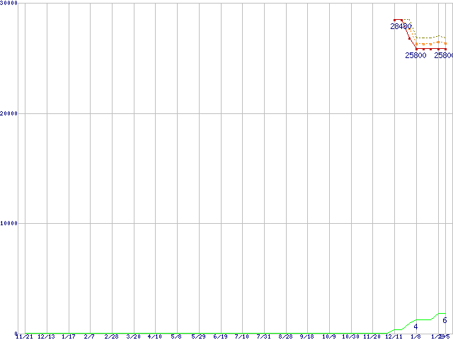 ※このグラフは過去のデータも税率5%相当に調整した税込み相当額のグラフです。 税率変更や、総額表示方式導入(2004年4月)の影響は除いています。 | | | ●凡例 | 最安値 (点線部は販売店未確認 または未調査) | 平均値 | 最高値 | ショップ数 |