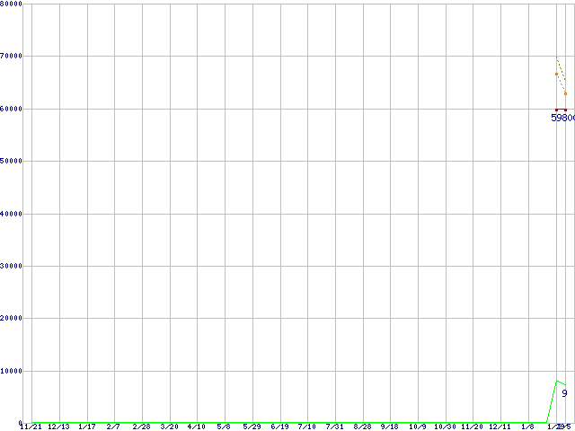 ※このグラフは過去のデータも税率5%相当に調整した税込み相当額のグラフです。 税率変更や、総額表示方式導入(2004年4月)の影響は除いています。 | | | ●凡例 | 最安値 (点線部は販売店未確認 または未調査) | 平均値 | 最高値 | ショップ数 |