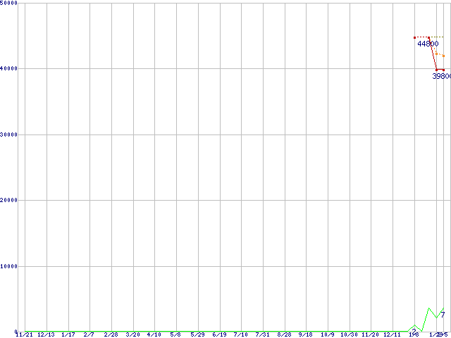 ※このグラフは過去のデータも税率5%相当に調整した税込み相当額のグラフです。 税率変更や、総額表示方式導入(2004年4月)の影響は除いています。 | | | ●凡例 | 最安値 (点線部は販売店未確認 または未調査) | 平均値 | 最高値 | ショップ数 |