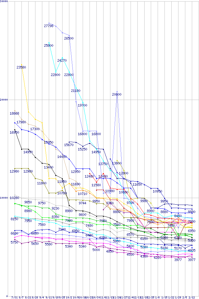 | HDD/SSD主要製品(最安値1万円未満)の最安値推移 | | | (2008年7月31日~2009年2月12日) |