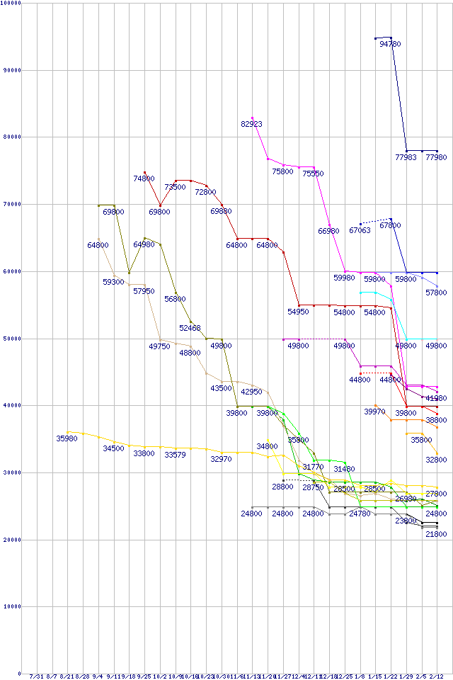 | HDD/SSD主要製品(最安値2万円以上)の最安値推移 | | | (2008年7月31日~2009年2月12日) |