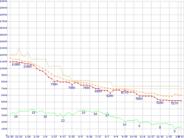 ※このグラフは過去のデータも税率5%相当に調整した税込み相当額のグラフです。 税率変更や、総額表示方式導入(2004年4月)の影響は除いています。 | | | ●凡例 | 最安値 (点線部は販売店未確認 または未調査) | 平均値 | 最高値 | ショップ数 |