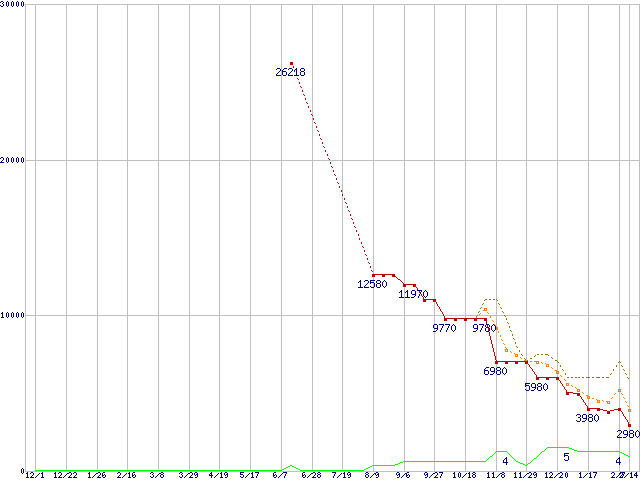※このグラフは過去のデータも税率5%相当に調整した税込み相当額のグラフです。 税率変更や、総額表示方式導入(2004年4月)の影響は除いています。 | | | ●凡例 | 最安値 (点線部は販売店未確認 または未調査) | 平均値 | 最高値 | ショップ数 |