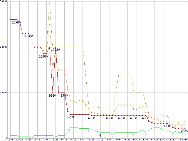 ※このグラフは過去のデータも税率5%相当に調整した税込み相当額のグラフです。 税率変更や、総額表示方式導入(2004年4月)の影響は除いています。 | | | ●凡例 | 最安値 (点線部は販売店未確認 または未調査) | 平均値 | 最高値 | ショップ数 |