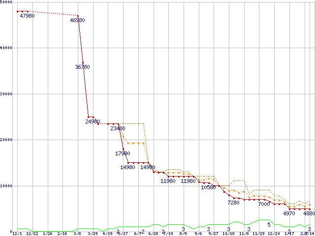 ※このグラフは過去のデータも税率5%相当に調整した税込み相当額のグラフです。 税率変更や、総額表示方式導入(2004年4月)の影響は除いています。 | | | ●凡例 | 最安値 (点線部は販売店未確認 または未調査) | 平均値 | 最高値 | ショップ数 |