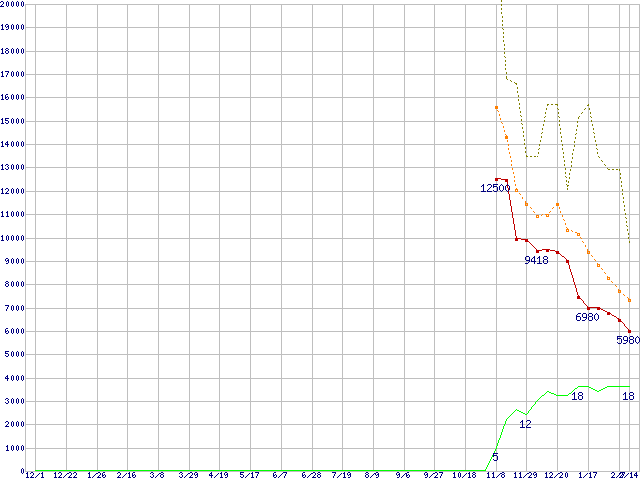 ※このグラフは過去のデータも税率5%相当に調整した税込み相当額のグラフです。 税率変更や、総額表示方式導入(2004年4月)の影響は除いています。 | | | ●凡例 | 最安値 (点線部は販売店未確認 または未調査) | 平均値 | 最高値 | ショップ数 |