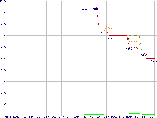 ※このグラフは過去のデータも税率5%相当に調整した税込み相当額のグラフです。 税率変更や、総額表示方式導入(2004年4月)の影響は除いています。 | | | ●凡例 | 最安値 (点線部は販売店未確認 または未調査) | 平均値 | 最高値 | ショップ数 |