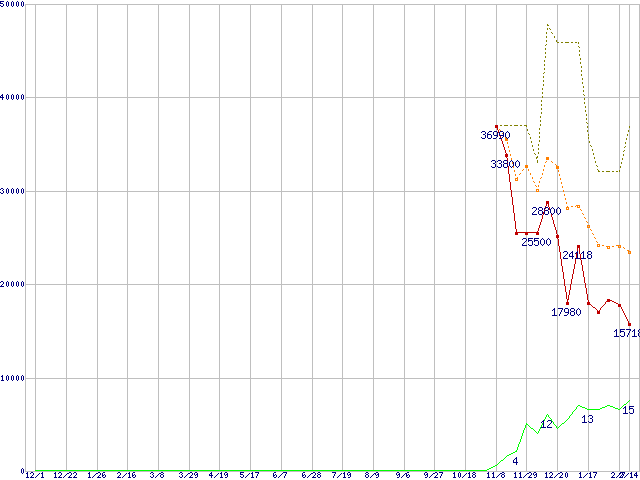 ※このグラフは過去のデータも税率5%相当に調整した税込み相当額のグラフです。 税率変更や、総額表示方式導入(2004年4月)の影響は除いています。 | | | ●凡例 | 最安値 (点線部は販売店未確認 または未調査) | 平均値 | 最高値 | ショップ数 |
