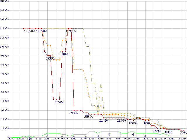 ※このグラフは過去のデータも税率5%相当に調整した税込み相当額のグラフです。 税率変更や、総額表示方式導入(2004年4月)の影響は除いています。 | | | ●凡例 | 最安値 (点線部は販売店未確認 または未調査) | 平均値 | 最高値 | ショップ数 |