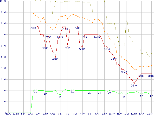 PC2-6400(DDR2-800) DDR2 SDRAM DIMMの最安値推移