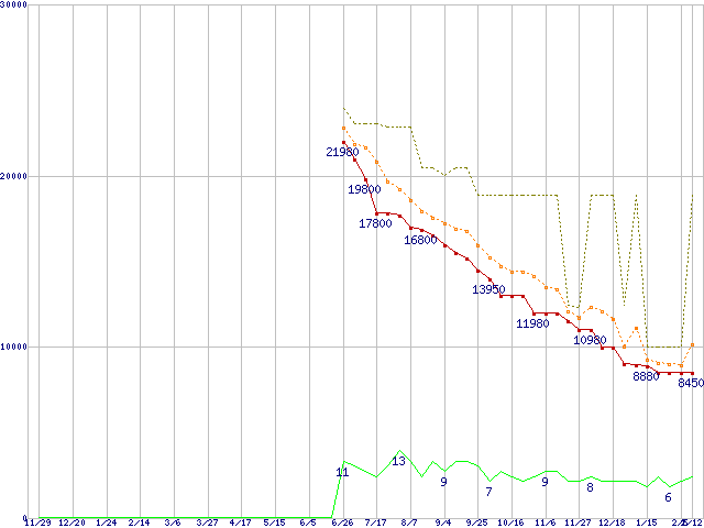※このグラフは過去のデータも税率5%相当に調整した税込み相当額のグラフです。 税率変更や、総額表示方式導入(2004年4月)の影響は除いています。 | | | ●凡例 | 最安値 (点線部は販売店未確認 または未調査) | 平均値 | 最高値 | ショップ数 |