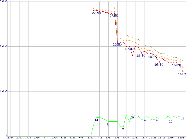 ※このグラフは過去のデータも税率5%相当に調整した税込み相当額のグラフです。 税率変更や、総額表示方式導入(2004年4月)の影響は除いています。 | | | ●凡例 | 最安値 (点線部は販売店未確認 または未調査) | 平均値 | 最高値 | ショップ数 |