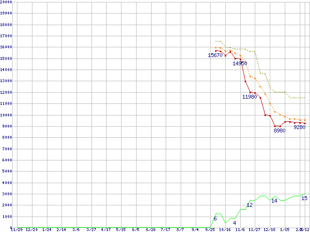 ※このグラフは過去のデータも税率5%相当に調整した税込み相当額のグラフです。 税率変更や、総額表示方式導入(2004年4月)の影響は除いています。 | | | ●凡例 | 最安値 (点線部は販売店未確認 または未調査) | 平均値 | 最高値 | ショップ数 |