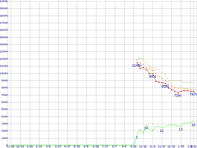 ※このグラフは過去のデータも税率5%相当に調整した税込み相当額のグラフです。 税率変更や、総額表示方式導入(2004年4月)の影響は除いています。 | | | ●凡例 | 最安値 (点線部は販売店未確認 または未調査) | 平均値 | 最高値 | ショップ数 |