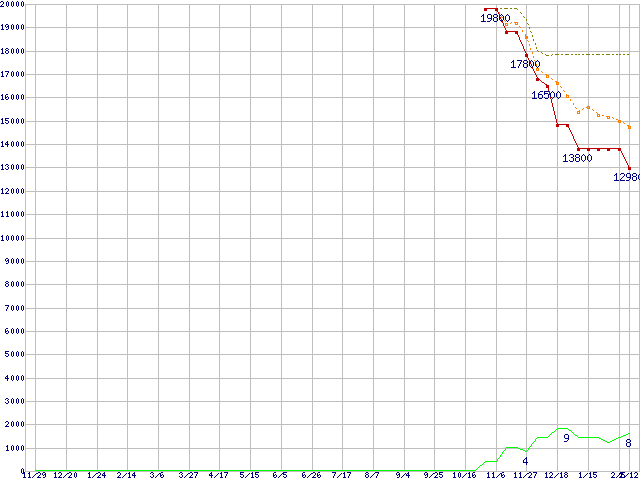 ※このグラフは過去のデータも税率5%相当に調整した税込み相当額のグラフです。 税率変更や、総額表示方式導入(2004年4月)の影響は除いています。 | | | ●凡例 | 最安値 (点線部は販売店未確認 または未調査) | 平均値 | 最高値 | ショップ数 |