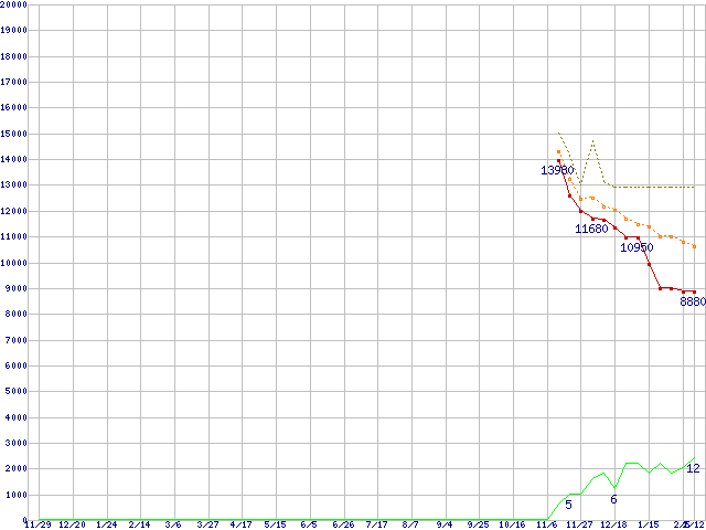 ※このグラフは過去のデータも税率5%相当に調整した税込み相当額のグラフです。 税率変更や、総額表示方式導入(2004年4月)の影響は除いています。 | | | ●凡例 | 最安値 (点線部は販売店未確認 または未調査) | 平均値 | 最高値 | ショップ数 |