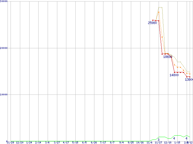 ※このグラフは過去のデータも税率5%相当に調整した税込み相当額のグラフです。 税率変更や、総額表示方式導入(2004年4月)の影響は除いています。 | | | ●凡例 | 最安値 (点線部は販売店未確認 または未調査) | 平均値 | 最高値 | ショップ数 |
