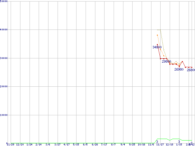 ※このグラフは過去のデータも税率5%相当に調整した税込み相当額のグラフです。 税率変更や、総額表示方式導入(2004年4月)の影響は除いています。 | | | ●凡例 | 最安値 (点線部は販売店未確認 または未調査) | 平均値 | 最高値 | ショップ数 |
