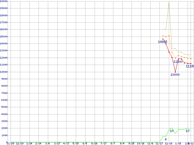 ※このグラフは過去のデータも税率5%相当に調整した税込み相当額のグラフです。 税率変更や、総額表示方式導入(2004年4月)の影響は除いています。 | | | ●凡例 | 最安値 (点線部は販売店未確認 または未調査) | 平均値 | 最高値 | ショップ数 |